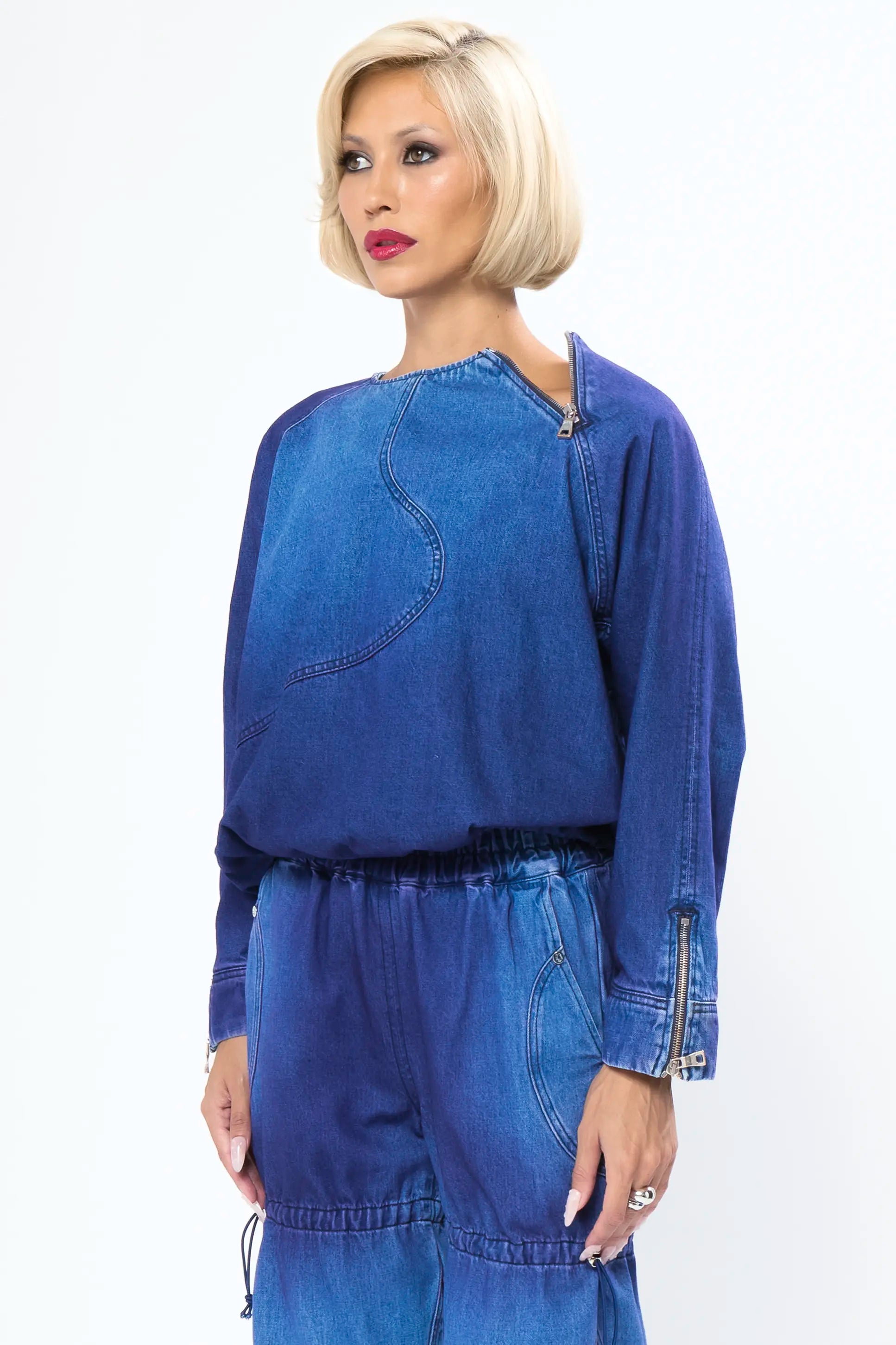 An oversized, airy crewneck pullover with cuff and neck opening zippers. Effortless and elevated, it looks as good as it feels. Finished with a bubble hem and fully lined in soft, sustainable dulled satin.