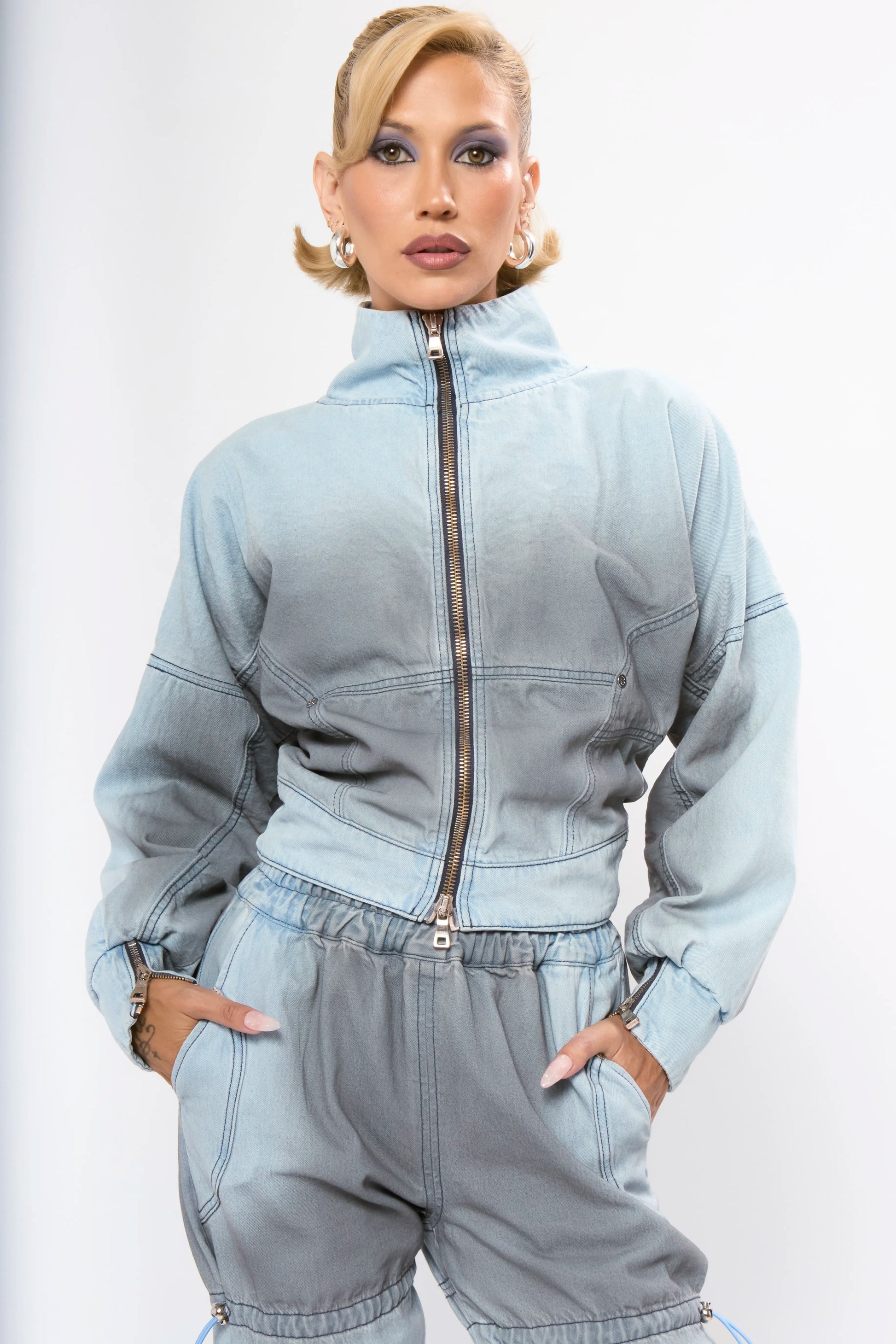 An elegantly structured dolman sleeve mock neck zip-up. Featuring a double zipper and form-fitting waist, this piece sculpts the body with precision seaming, offering a commanding silhouette. Fully lined with a soft, sustainable dulled satin interior for a luxurious feel.
